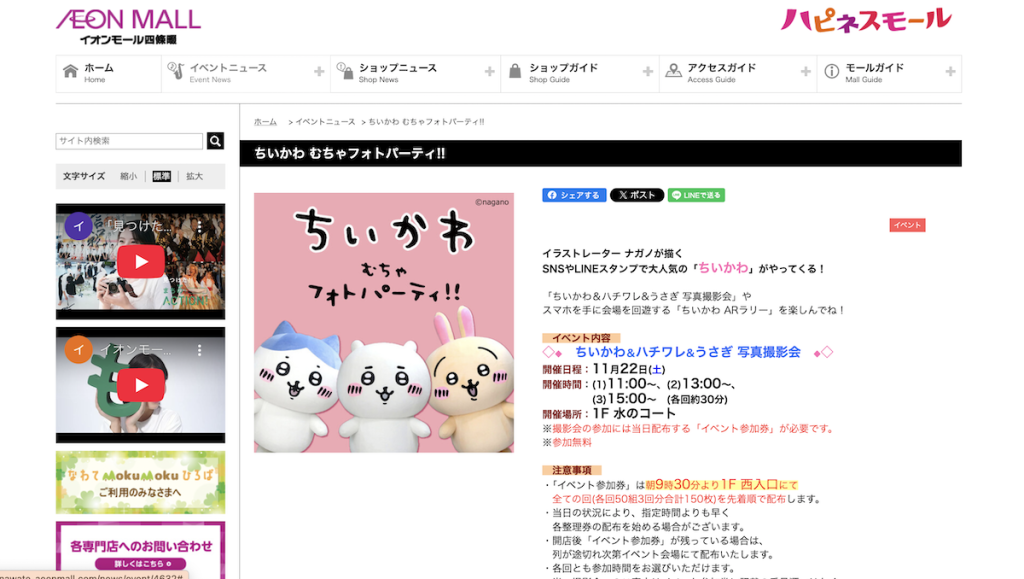 イオンモール四條畷の公式サイトによると、11月22日に「ちいかわ&ハチワレ&うさぎ写真撮影会」「ちいかわ ARラリー」が開催されるようです。