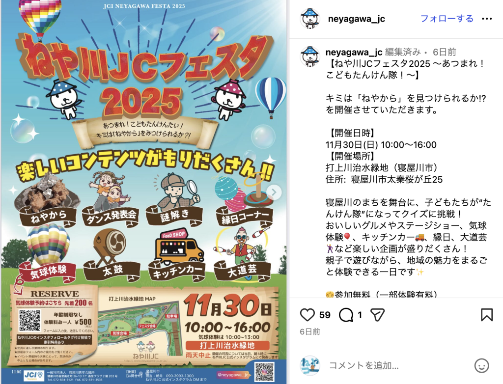 打上川治水緑地で「ねや川JCフェスタ2025~あつまれ!こどもたんけん隊!~」が開催されるようです。