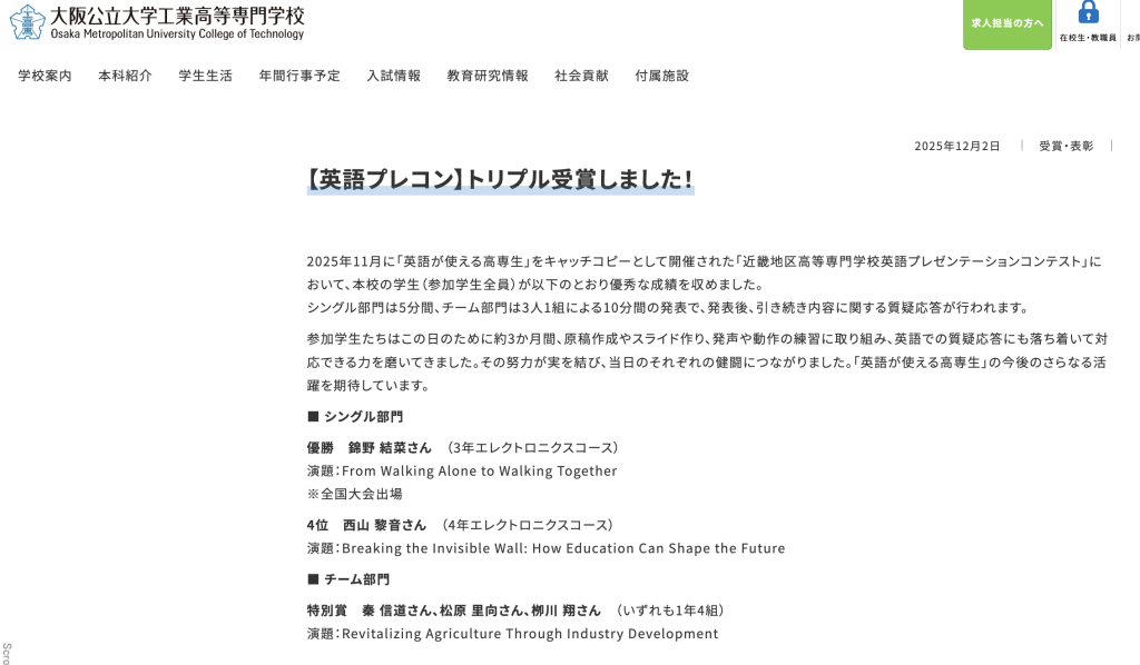 大阪公立大学工業高等専門学校の学生が「近畿地区高等専門学校英語プレゼンテーションコンテスト」で優勝したようです。
