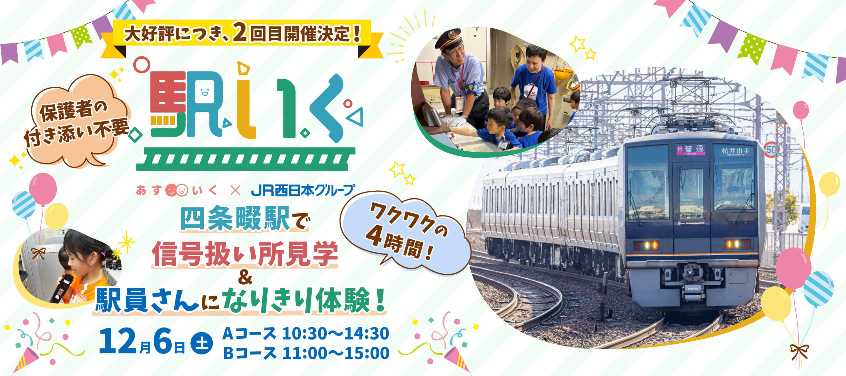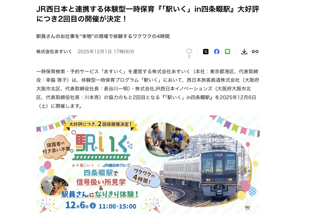 PR TIMESによると、年中~年長のお子さんが対象のJR西日本と連携する体験型一時保育「駅いくin四条畷駅」が開催されるとのこと。今年の5月にも開催されていて、大好評だったようです。