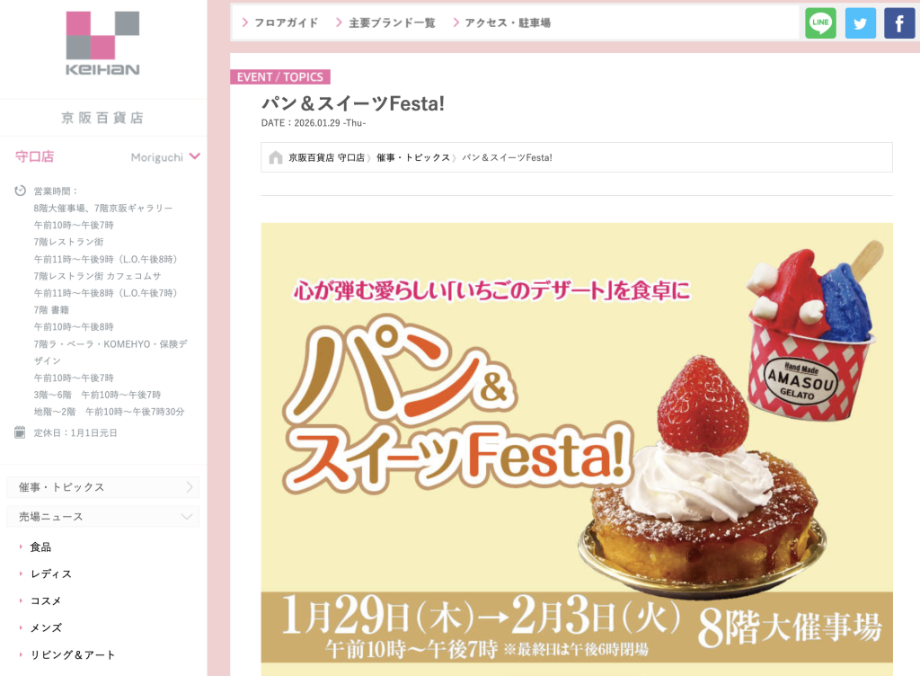 京阪百貨店 守口店で「パン&スイーツFesta!」が開催されるとのこと。様々なパンやスイーツが販売され、日替り限定販売の商品もあるようです。