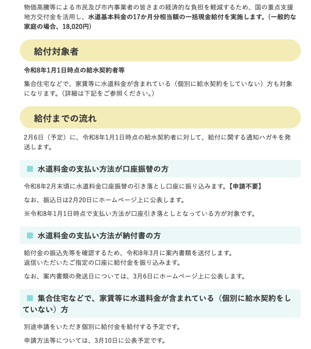 2月6日に、2026年1月1日時点の給水契約者に対して、給付に関する通知ハガキを発送する予定とのこと。