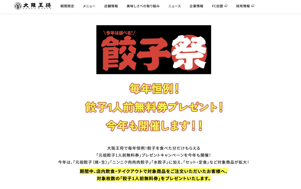 大阪王将「1人前無料券」餃子食べた分だけもらえる