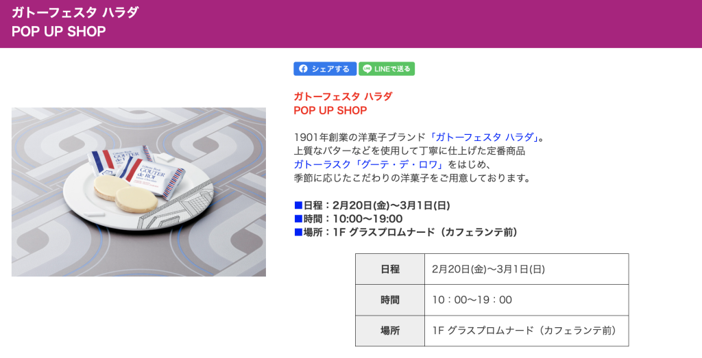 公式サイトによると、「ガトーフェスタ ハラダ POP UP SHOP」が開催されることがわかります。