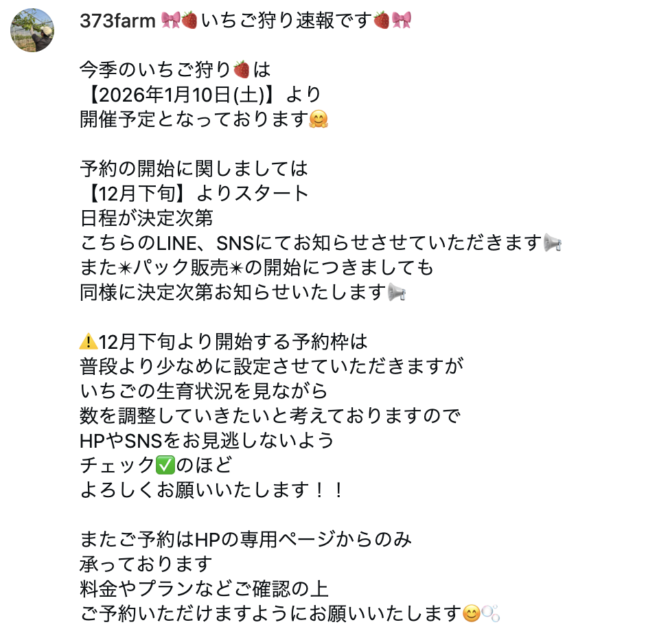 Instagramを見ると、いちご狩りの予約が12月下旬に始まることがわかります。日程が決定次第、SNSなどでお知らせがあるとのこと。パック販売の開始についても、決定次第お知らせがあるようです。
