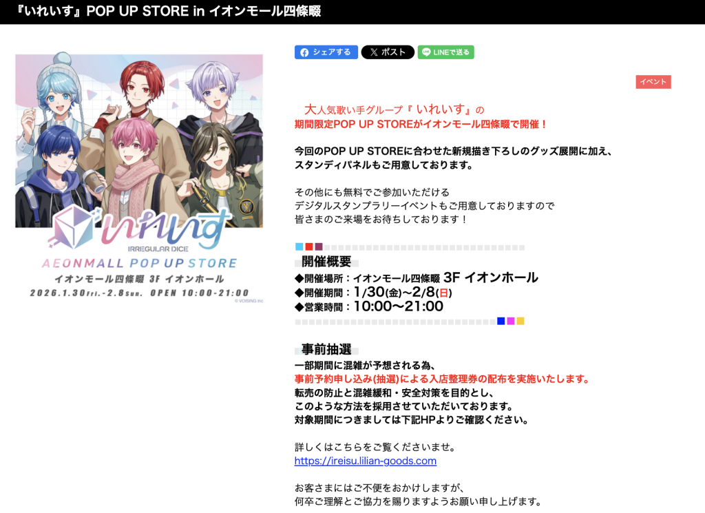 イオンモール四條畷で「『いれいす』POP UP STORE」が開催されるようです。