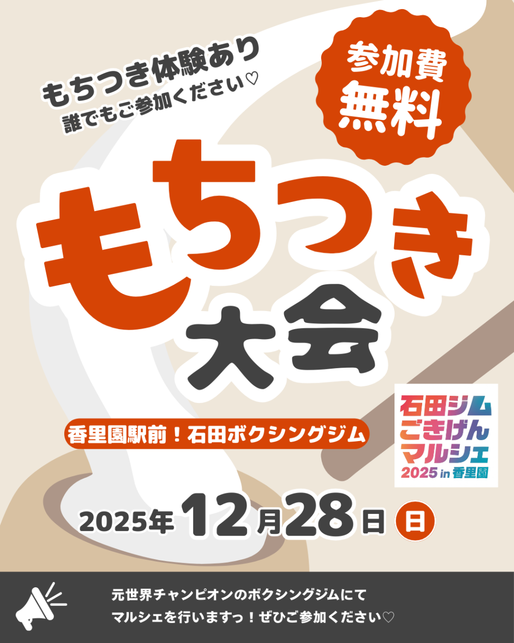 香里園のジムでマルシェ!お餅つき無料。12/28