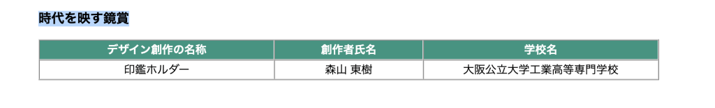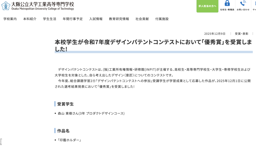 大阪公立大学工業高等専門学校の学生がデザインパテントコンテストにおいて優秀賞を受賞したようです。