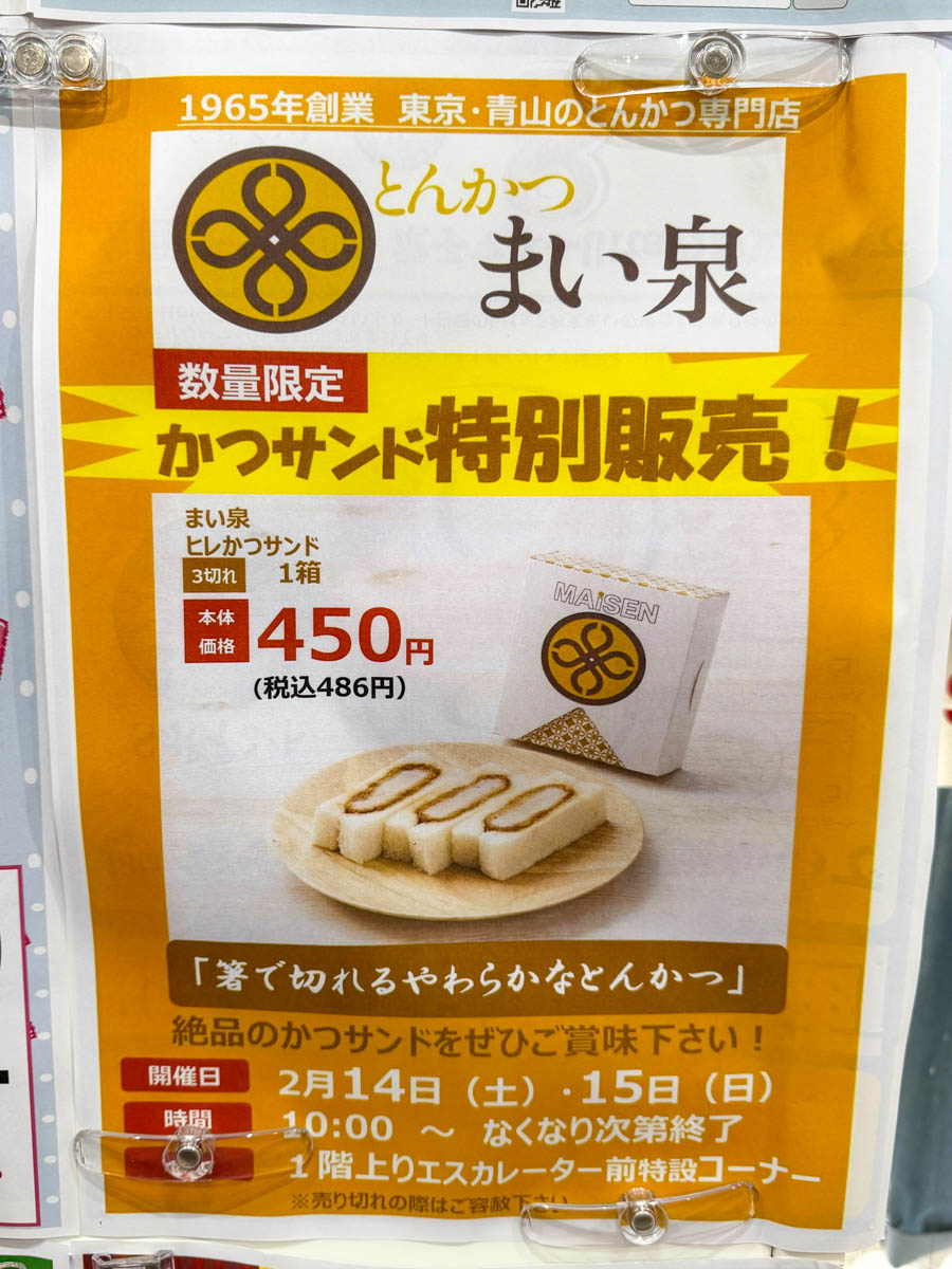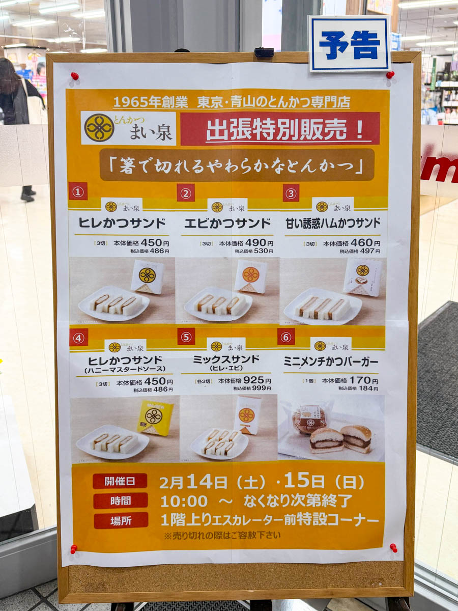 「とんかつ まい泉」の出張特別販売が行われることがわかります。いろんな種類のかつサンドのほかに、ミニメンチかつバーガーもあるようです。「甘い誘惑ハムかつサンド」って名前が素敵。