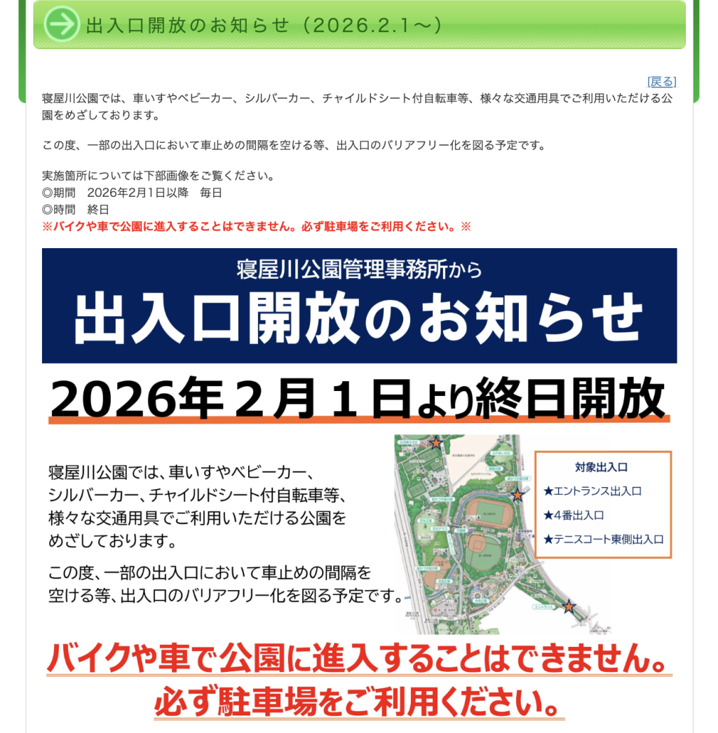 寝屋川公園の一部の出入口が開放されるようです。