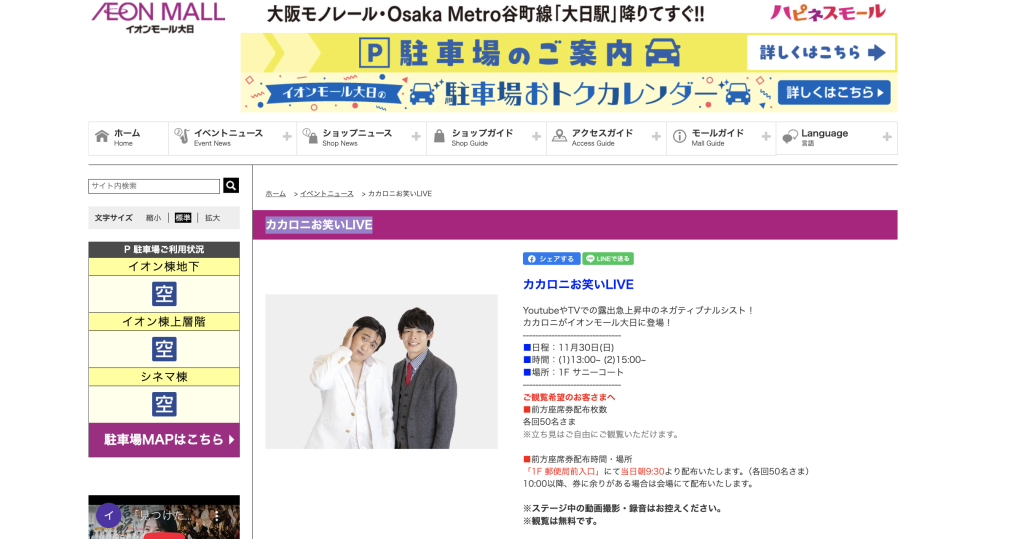 イオンモール大日の公式サイトによると、11月30日の13時〜と15時〜、「カカロニお笑いLIVE」が開催されるようです。