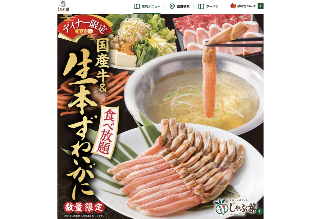 松屋町にある「しゃぶ葉 香里園店」でも『国産牛&生本ずわいがに食べ放題』が開催中のようです。