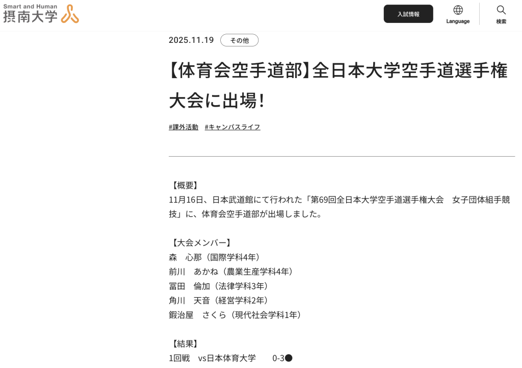 摂南大学の公式サイトによると、11月16日に行われた「第69回 全日本大学空手道選手権大会 女子団体組手競技」に体育会空手道部が出場したことがわかります。