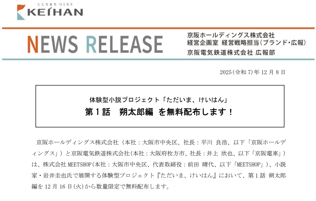 リリースによると、京阪沿線を舞台に実在する駅や街、お店などを取り上げた書下ろし小説「『ただいま、けいはん』第1話 朔太郎編」が12月16日10時から数量限定で無料配布されるとのこと。