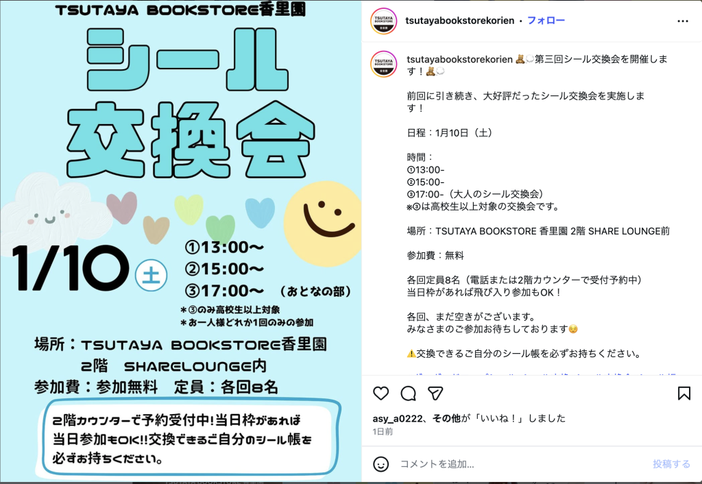 「TSUTAYA BOOKSTORE 香里園店」で『シール交換会』が開催されるようです。