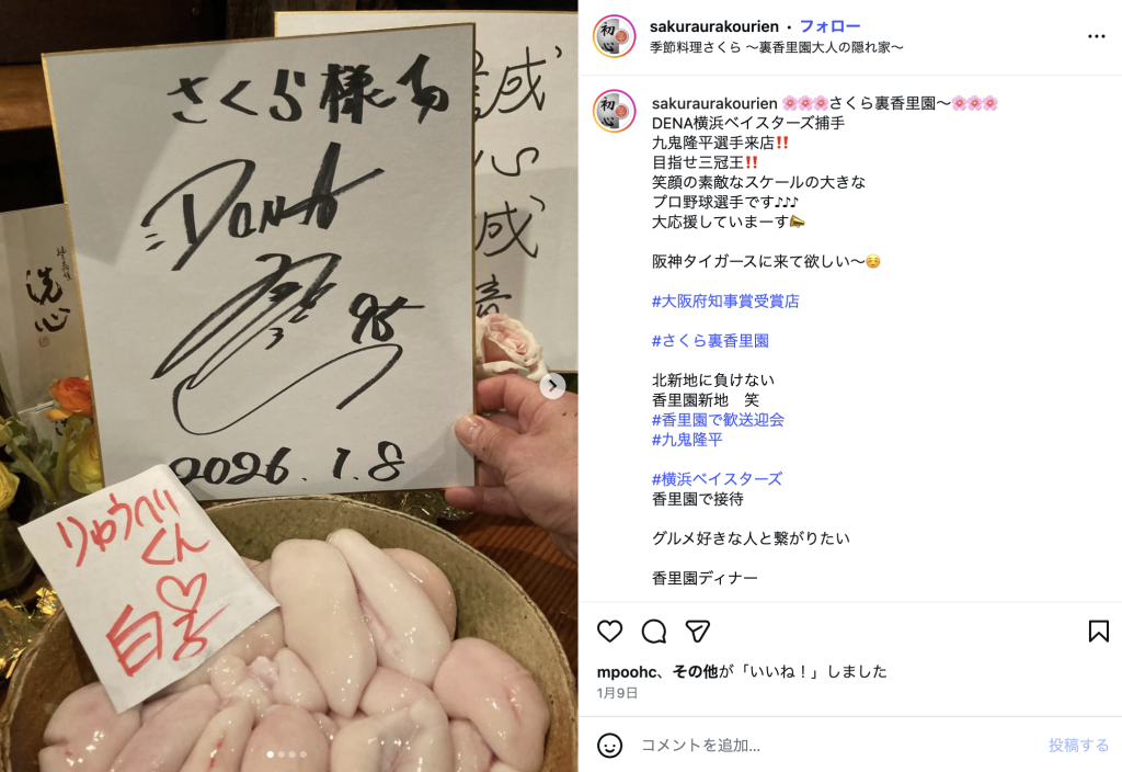 お店のInstagramによると、横浜DeNAベイスターズ所属の九鬼隆平選手が来店していたことがわかります。