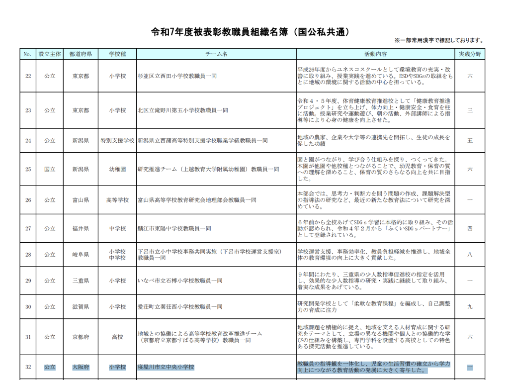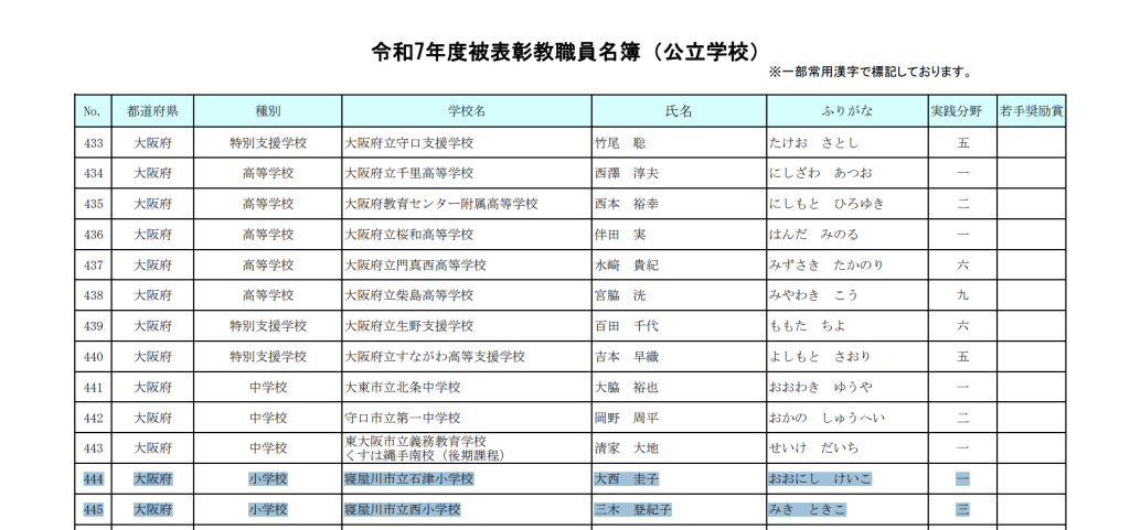 寝屋川市立の小学校教員と教職員組織が「令和7年度 文部科学大臣優秀教職員表彰」を受賞したようです。