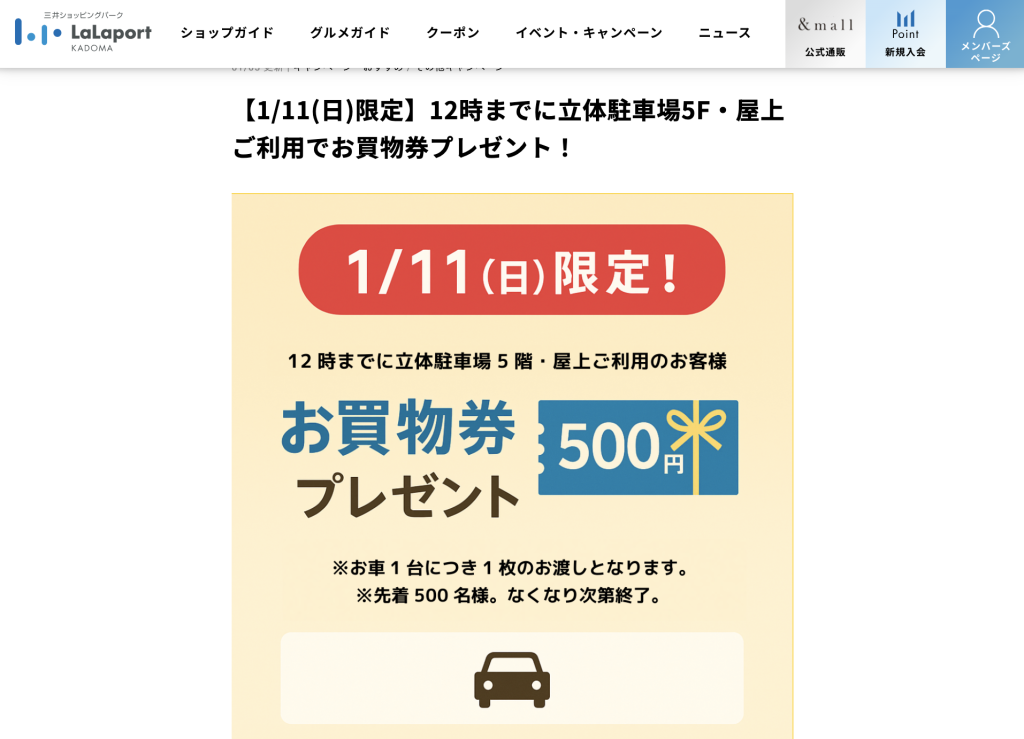 1月11日の12時までにららぽーと門真の立体駐車場5F・屋上を利用するとお買物券がもらえるようです。