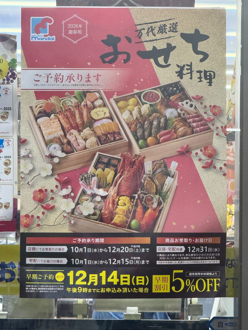 貼紙や公式サイトによると、万代厳選のおせち料理の予約が始まっており、12月14日までの早期予約で5%OFFになるのだとか!(一部対象外商品あり)
