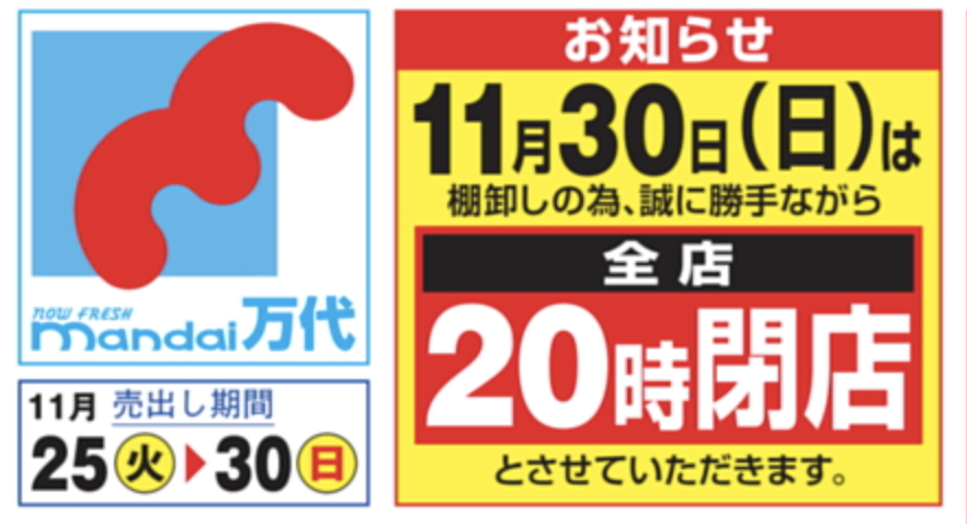 11月30日は万代全店で20時閉店となるようです。