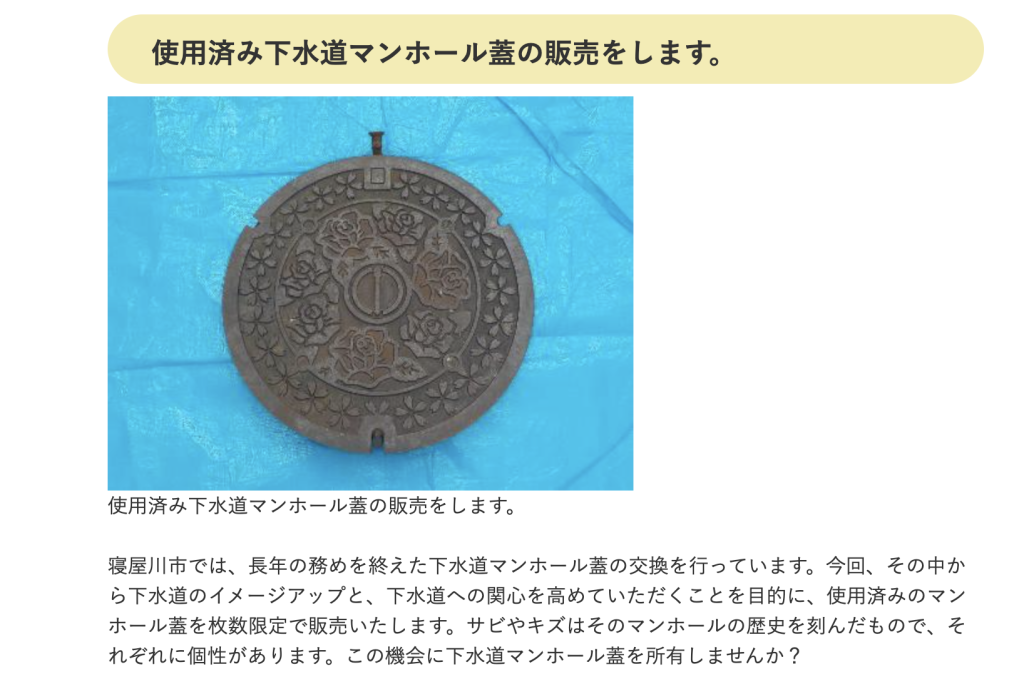 寝屋川市が下水道マンホール蓋を販売するようです。