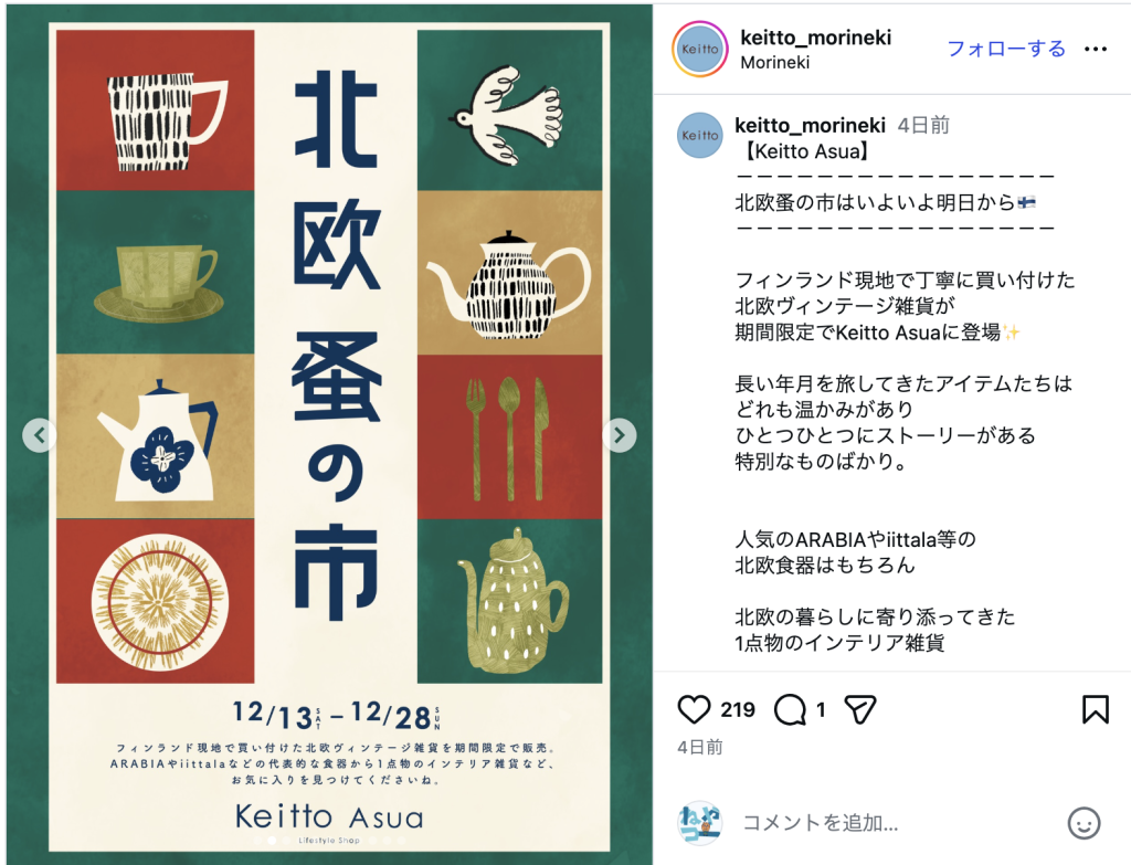 自分だけのお気に入りに出会えそう。北欧デザインやヴィンテージ雑貨に興味がある方は要チェックですね!期間は12月13日〜12月28日までです。