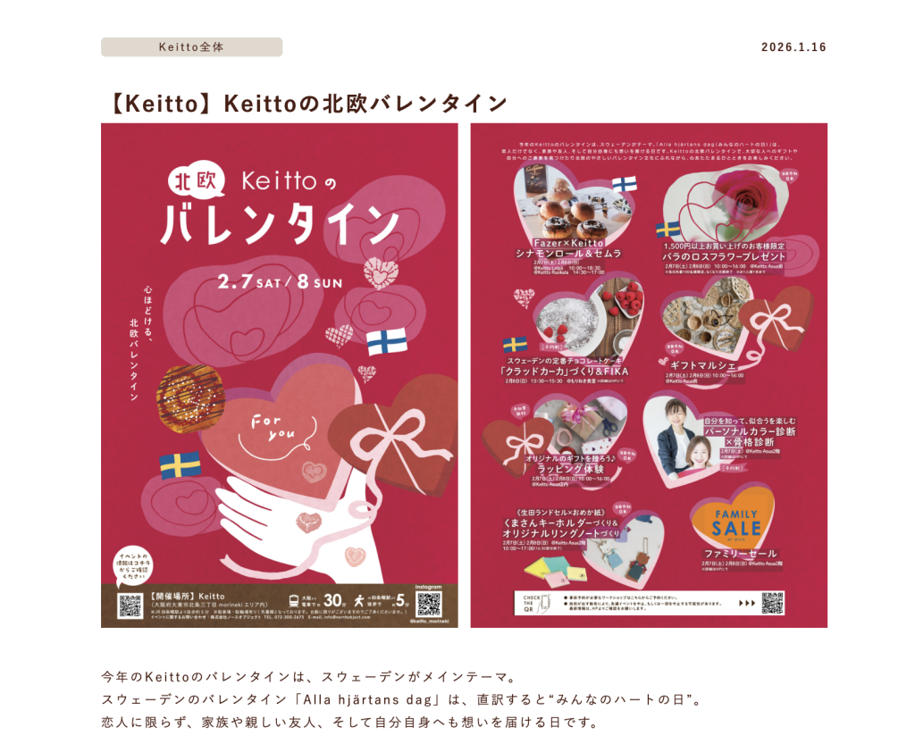 四条畷駅近くにあるmorinekiの「Keitto」で『Keittoの北欧バレンタイン』が開催されるようです。