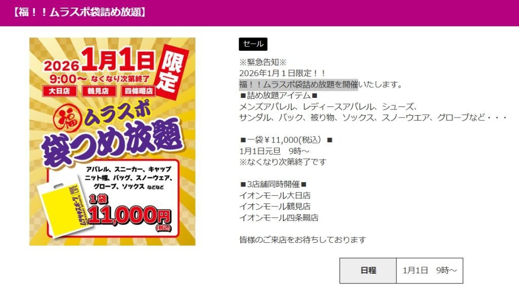 色々なアイテムがお得にゲットできる一大イベントですね~!気になった人は、元旦ムラスポへ行ってみては。