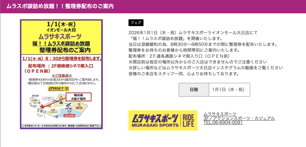 イオンモール大日とイオンモール四條畷で「福!!ムラスポ袋詰め放題」が開催されるようです。