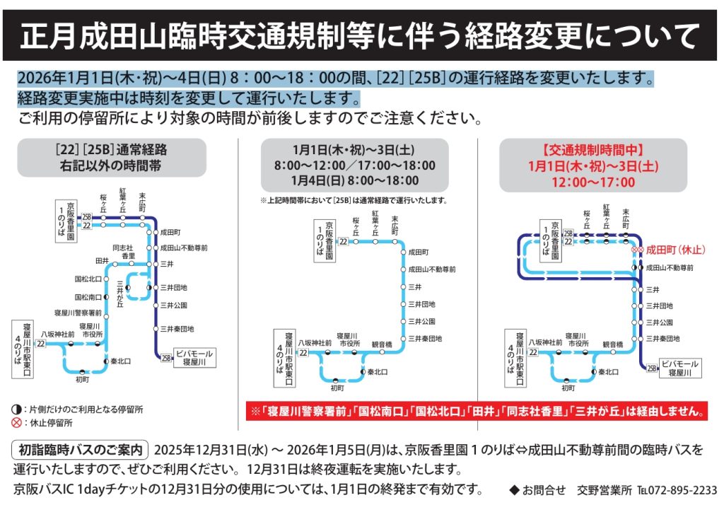 12月31日~2026年1月5日は、京阪香里園1のりば⇔成田山不動尊前間の臨時バスの運行のほか、12月31日は終夜運転を実施するそうですよ。成田山へ初詣に行こうと思っている方は要チェックです。