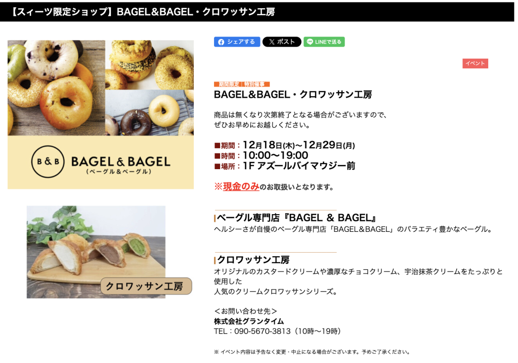 イオンモール四條畷に「BAGEL&BAGEL」「クロワッサン工房」の期間限定店が出店しているようです。