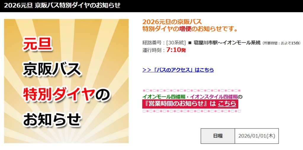 京阪バスの元旦ダイヤの、寝屋川市駅〜イオンモール系統。