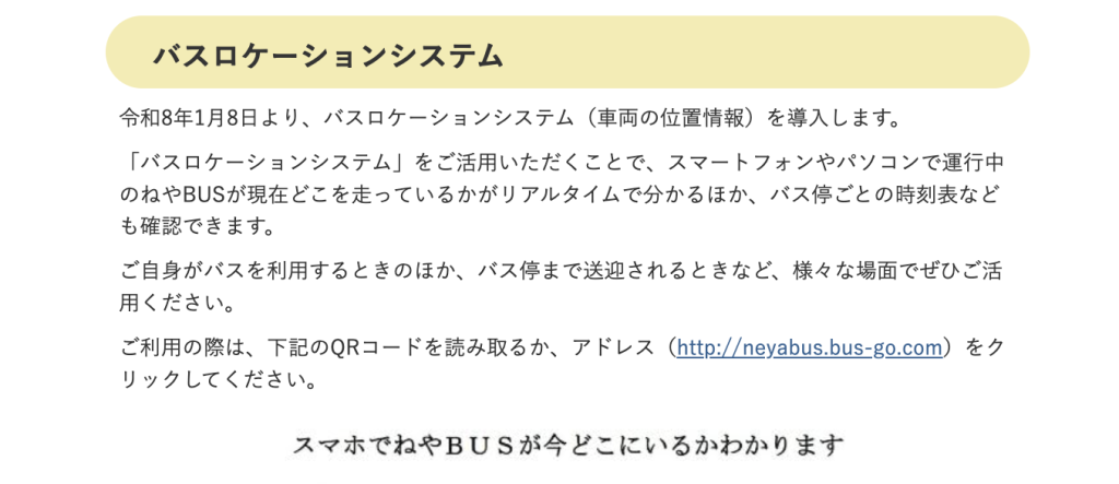 どちらのサービスも開始日は1月8日。ねやBUSを日常の移動に使っている方は、新しい便利な機能を活用してみては。