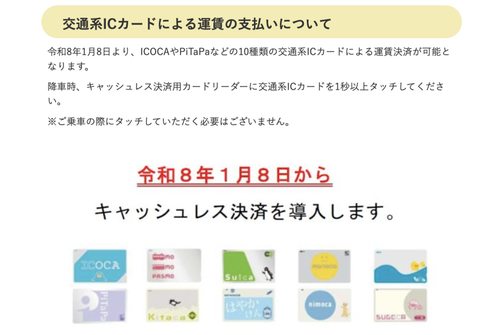 交通系ICカード(ICOCA・PiTaPaなど10種類)による運賃の支払いも可能となるようです。
