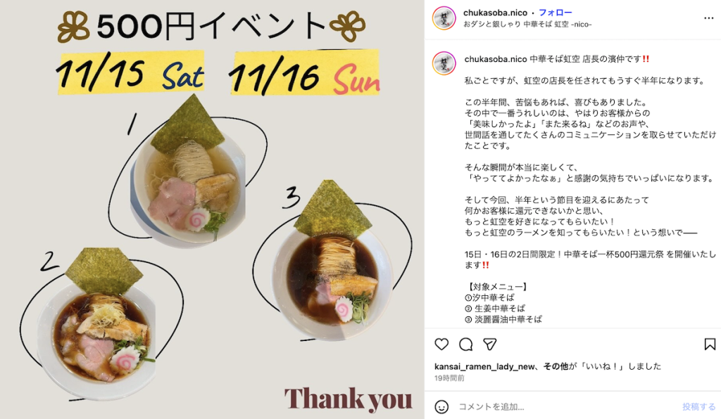 中華そば 虹空 -nico-のInstagramの投稿によると、11月15日・16日の2日間限定で、「中華そば一杯500円還元祭」が開催されるとのこと。