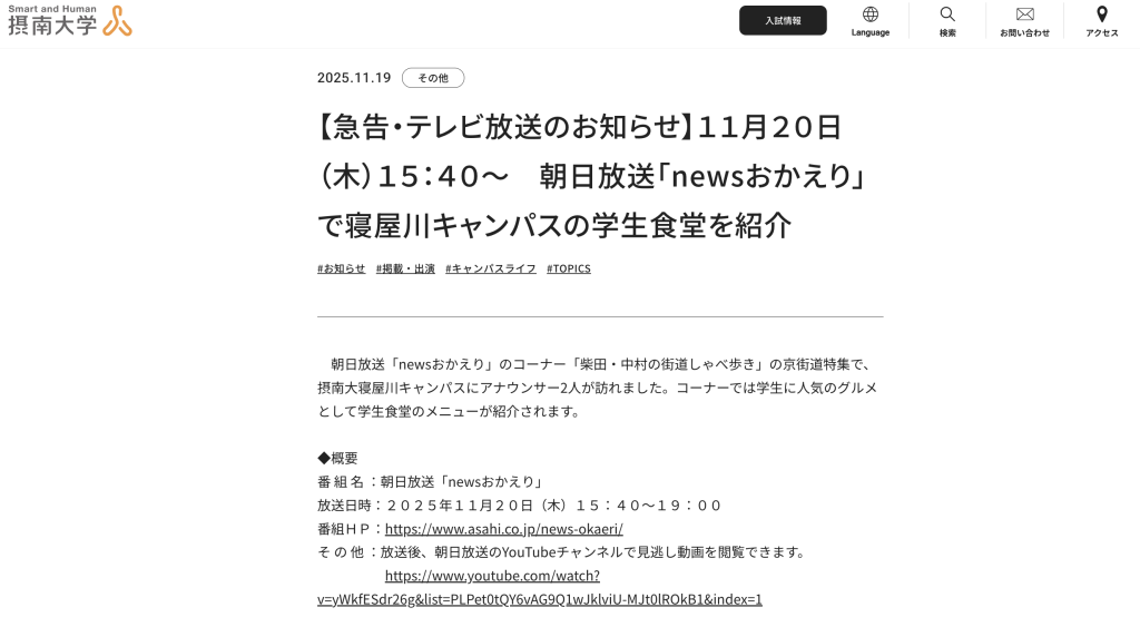 寝屋川キャンパスにアナウンサー2人が訪れ、学生に人気のグルメとして学生食堂のメニューが紹介されるとのこと。番組の放送は本日11月20日15時40分からなので、お時間合う方はご覧になってみては!