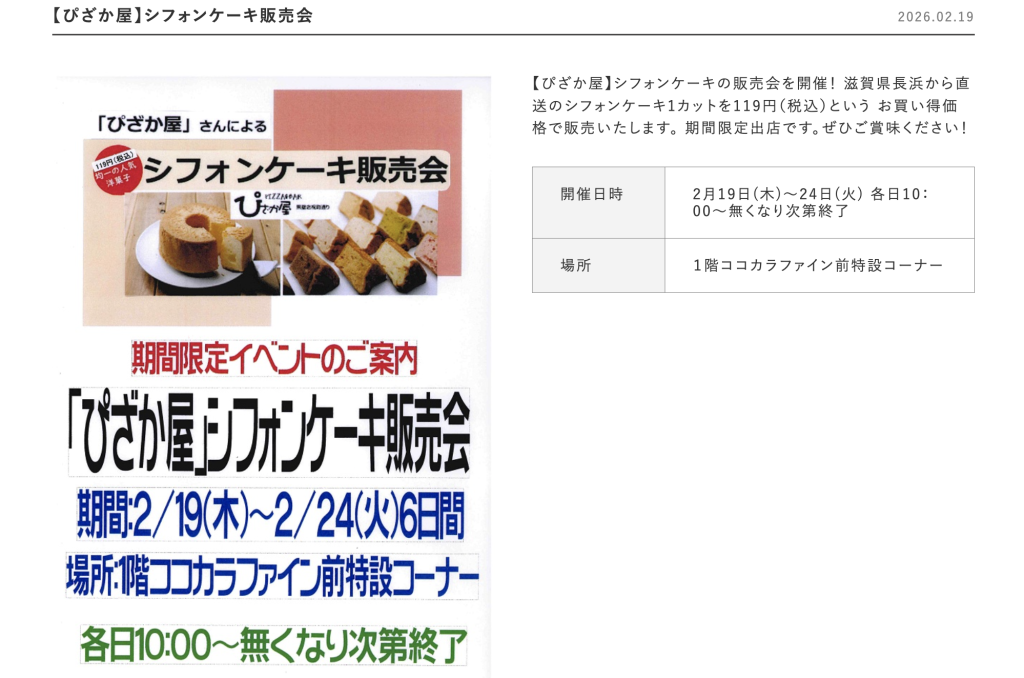 公式サイトによると、「ぴざか屋」のシフォンケーキの販売会が開催されているようです。滋賀県長浜市から直送のシフォンケーキが販売されているようで、税込119円均一(1カット)なんだとか!