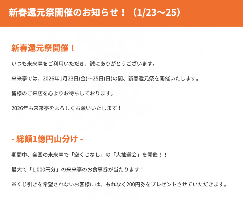 最大で「1,000円分」の来来亭のお食事券が当たるそうで、くじ引きを希望しない場合は200円券がもらえるそうです。
