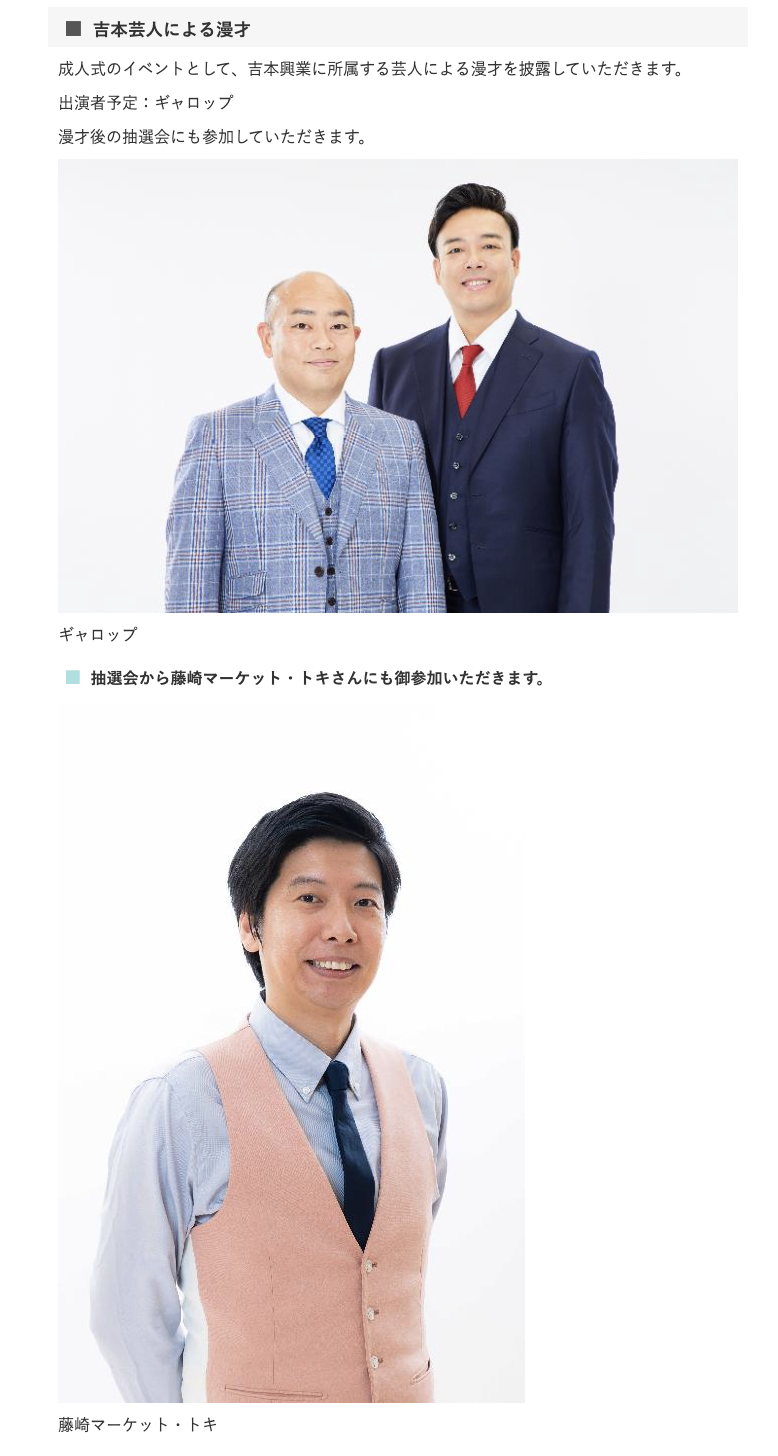 寝屋川市立市民会館で開催される「第72回 寝屋川市成人式」にお笑いコンビのギャロップ・藤崎マーケットのトキさんが来るようです。