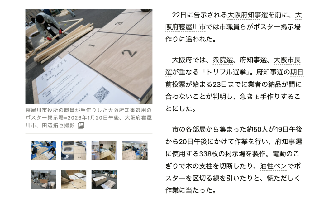 朝日新聞によると、作られたポスター掲示板は合計338枚。電動のこぎりで木の支柱を切断したり、油性ペンでポスターを区切る線を引いたりといった作業が行われたようです。
