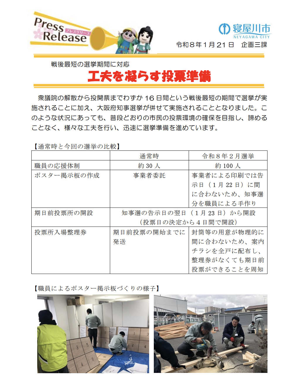 こうした状況でも、普段どおりの投票環境を確保するため、寝屋川市ではさまざまな工夫を重ねながら選挙準備を進めているようです。