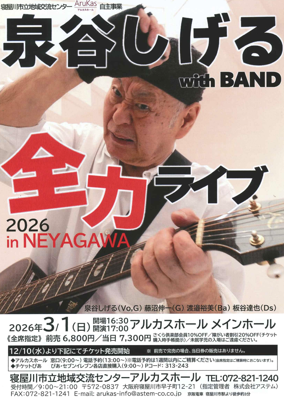 公式Xによると、2026年3月1日に「泉谷しげるwithBAND 全力ライブ2026in NEYAGAWA」が開催されることがわかります。