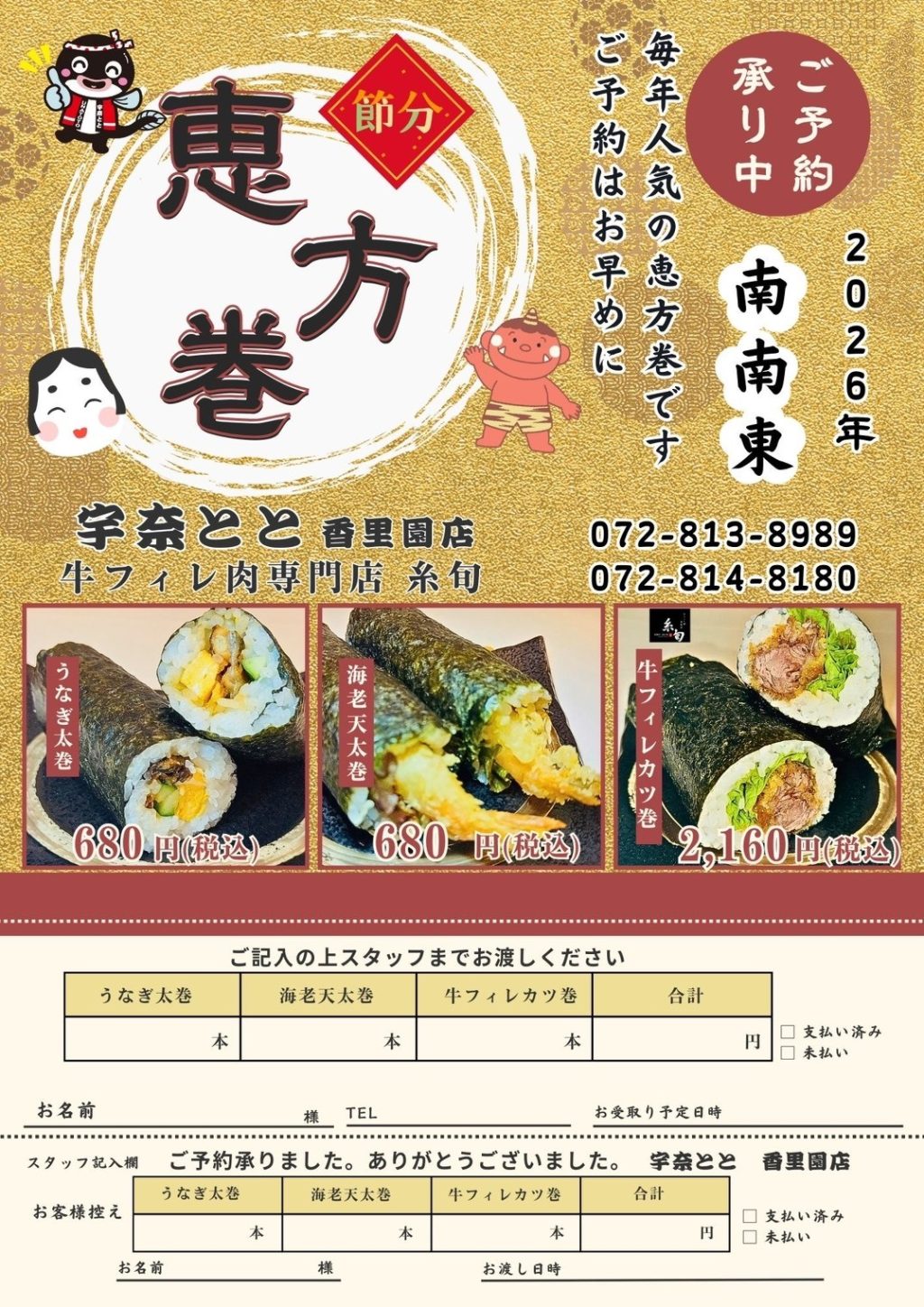 「牛フィレ肉専門店 糸旬」「名代 宇奈とと 香里園店」で恵方巻の予約を受け付けているようです。