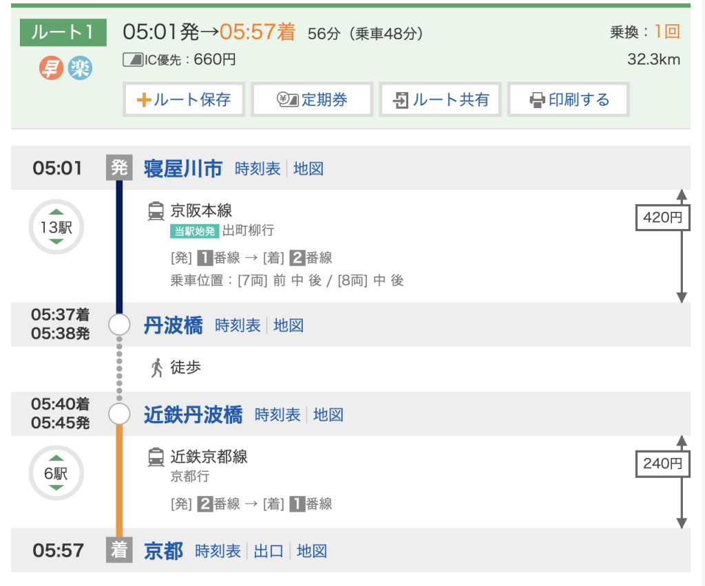 案として挙げられているのは、寝屋川市駅からでは5時1分に出発する出町柳行きの始発電車に乗車し、丹波橋駅で近鉄線へ乗り換えるルート。京都駅には5時57分に到着します。