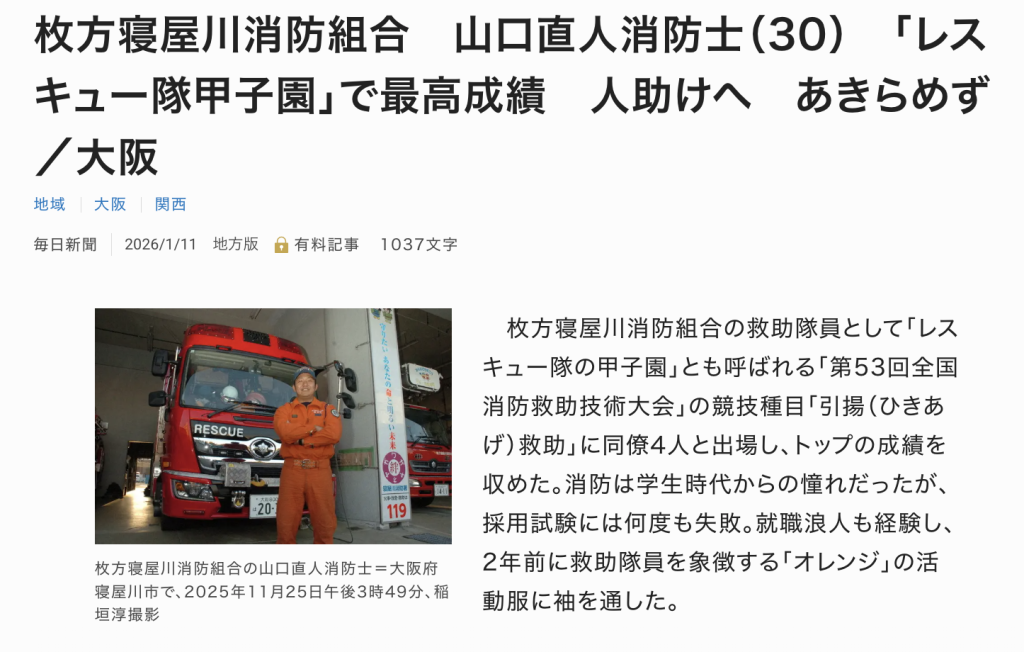 毎日新聞で枚方寝屋川消防組合の消防士さんが取り上げられています。