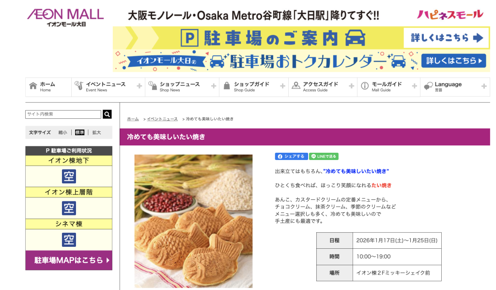 イオンモール大日に「冷めても美味しいたい焼き」の期間限定店が出店しているようです。