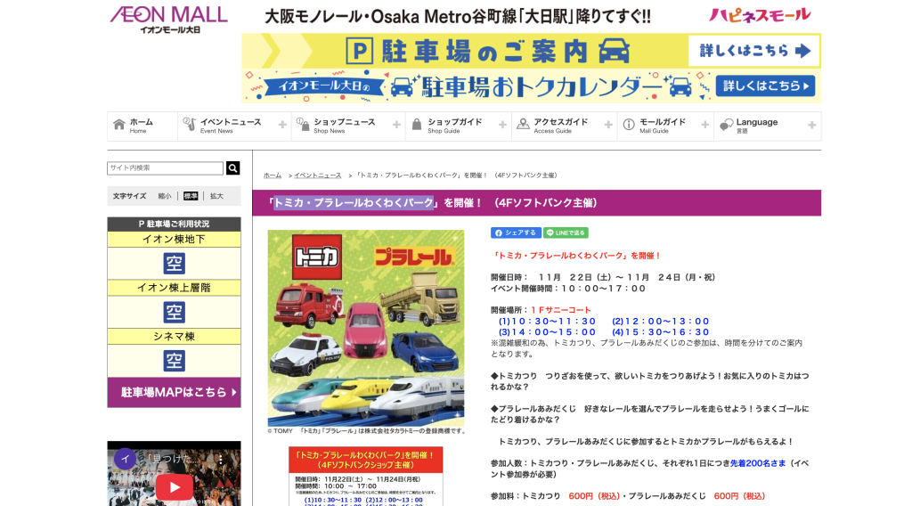 イオンモール大日で「トミカ・プラレールわくわくパーク」が開催されるようです。