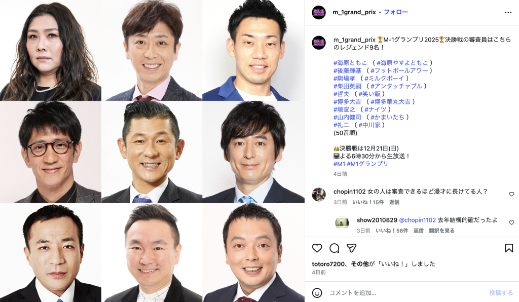 Instagramを見ると、「M-1グランプリ2025」決勝戦の審査員の9名が発表されており、海原ともこさんが今年も審査員に就任していることがわかります。
