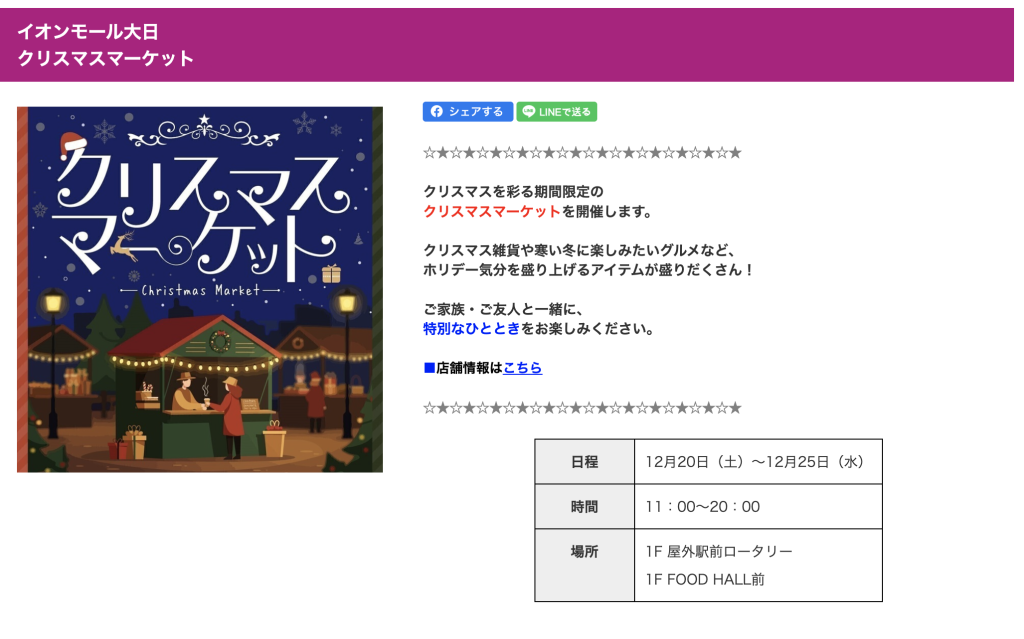 イオンモール大日で「クリスマスマーケット」が開催されるようです。
