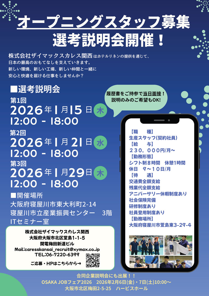 他にも、2月6日(金)&7日(土)に梅田にて大阪府が主催する合同企業説明会へ出店予定です。